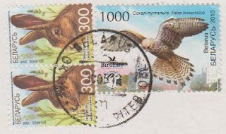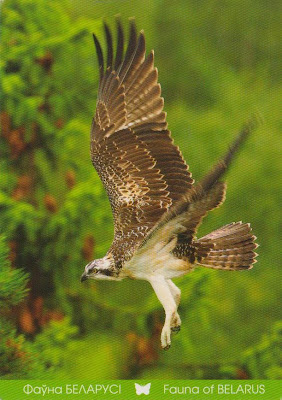 Osprey or Pandion Haliaetus is also known as sea hawk or fish eagle, and accordingly it is nesting near bodies of water that provide adequate food supplies. It is wide-spread, but still not in my country..! The stamp looks like its matching the image but is actually of a kestrel - still very beautiful, and its a joy to get a different stamp from Belarus (as opposed to cute but omnipresent definitives)! Thanks for that Lady Che :)