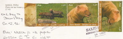 It must be quite an experience to fly over the Nazca lines, i hope it'll be 3rd time lucky and I'll be able to see them one day...The stamps show a curious creature called the bush dog (Speothos venaticus).